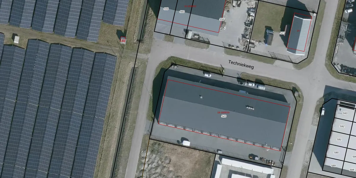 Het perceel waarop Techniekweg 18-0019 staat heeft een oppervlakte van 3341 m². Dit is een zeer groot perceel. De perceeloppervlakte wordt geregistreerd door het Kadaster. Gedetailleerde informatie over de maten van dit perceel kunt u vinden in het rapport Kadastrale kaart met maatvoering van Techniekweg 18-0019.
