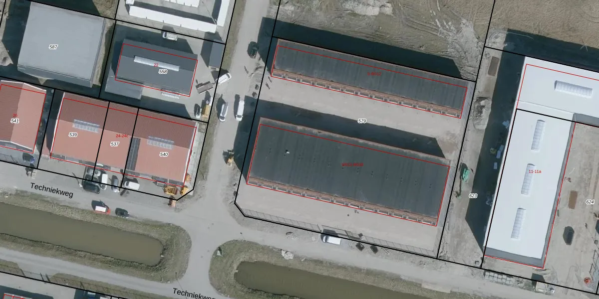 Het perceel waarop Techniekweg 9-015 staat heeft een oppervlakte van 4228 m². Dit is een zeer groot perceel. De perceeloppervlakte wordt geregistreerd door het Kadaster. Gedetailleerde informatie over de maten van dit perceel kunt u vinden in het rapport Kadastrale kaart met maatvoering van Techniekweg 9-015.