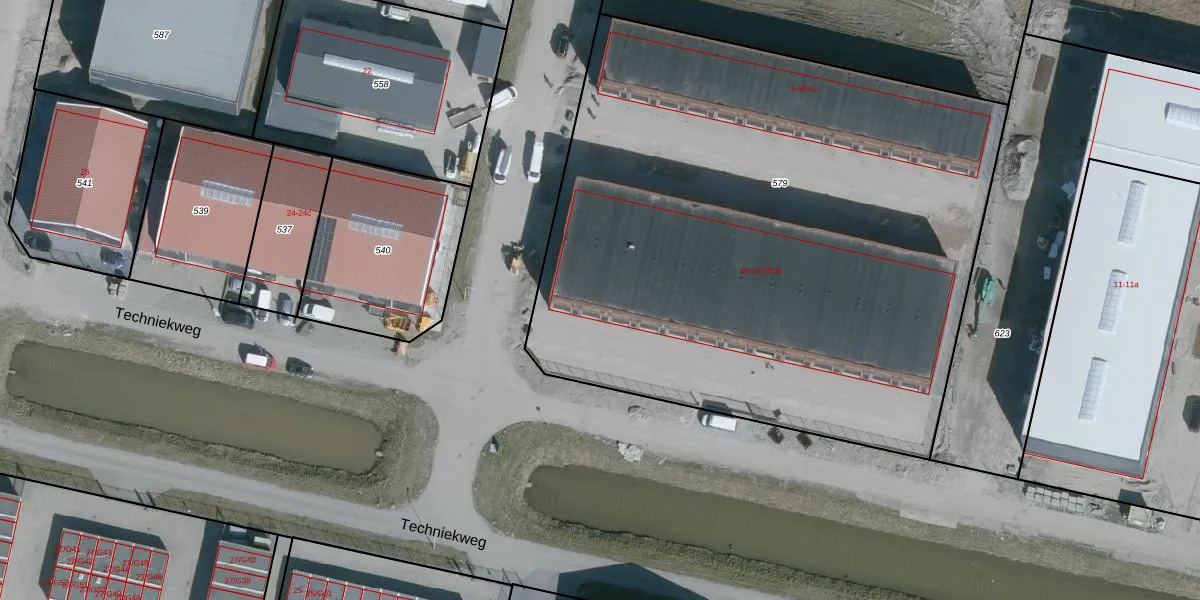 Het perceel waarop Techniekweg 9-027 staat heeft een oppervlakte van 4228 m². Dit is een zeer groot perceel. De perceeloppervlakte wordt geregistreerd door het Kadaster. Gedetailleerde informatie over de maten van dit perceel kunt u vinden in het rapport Kadastrale kaart met maatvoering van Techniekweg 9-027.