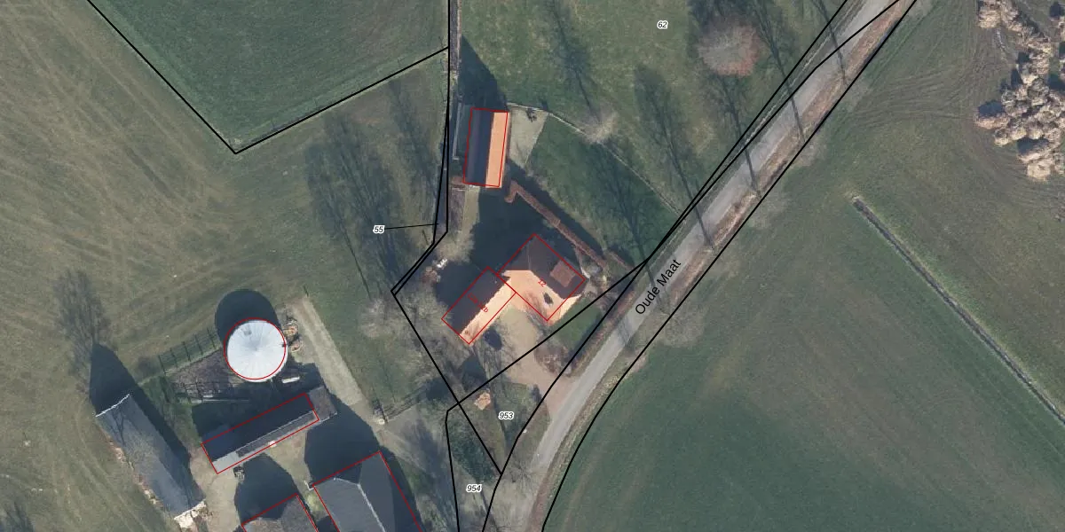 Het perceel waarop Oude Maat 12 staat heeft een oppervlakte van 4410 m². Dit is een zeer groot perceel. De perceeloppervlakte wordt geregistreerd door het Kadaster. Gedetailleerde informatie over de maten van dit perceel kunt u vinden in het rapport Kadastrale kaart met maatvoering van Oude Maat 12.