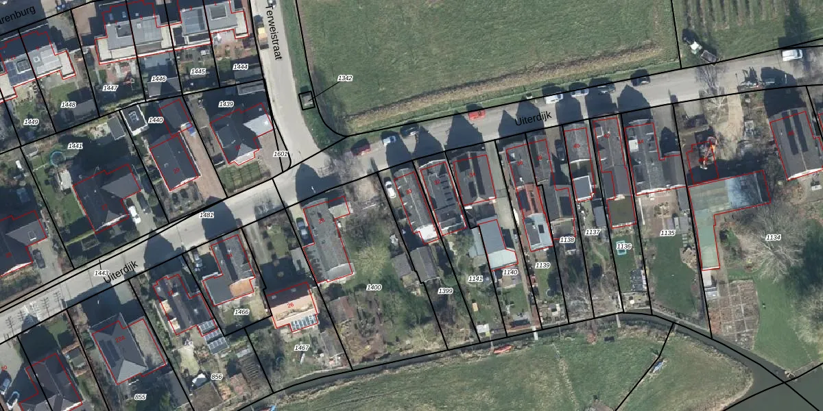 Het perceel waarop Uiterdijk 30 staat heeft een oppervlakte van 373 m². Dit is een groot perceel. De perceeloppervlakte wordt geregistreerd door het Kadaster. Gedetailleerde informatie over de maten van dit perceel kunt u vinden in het rapport Kadastrale kaart met maatvoering van Uiterdijk 30.