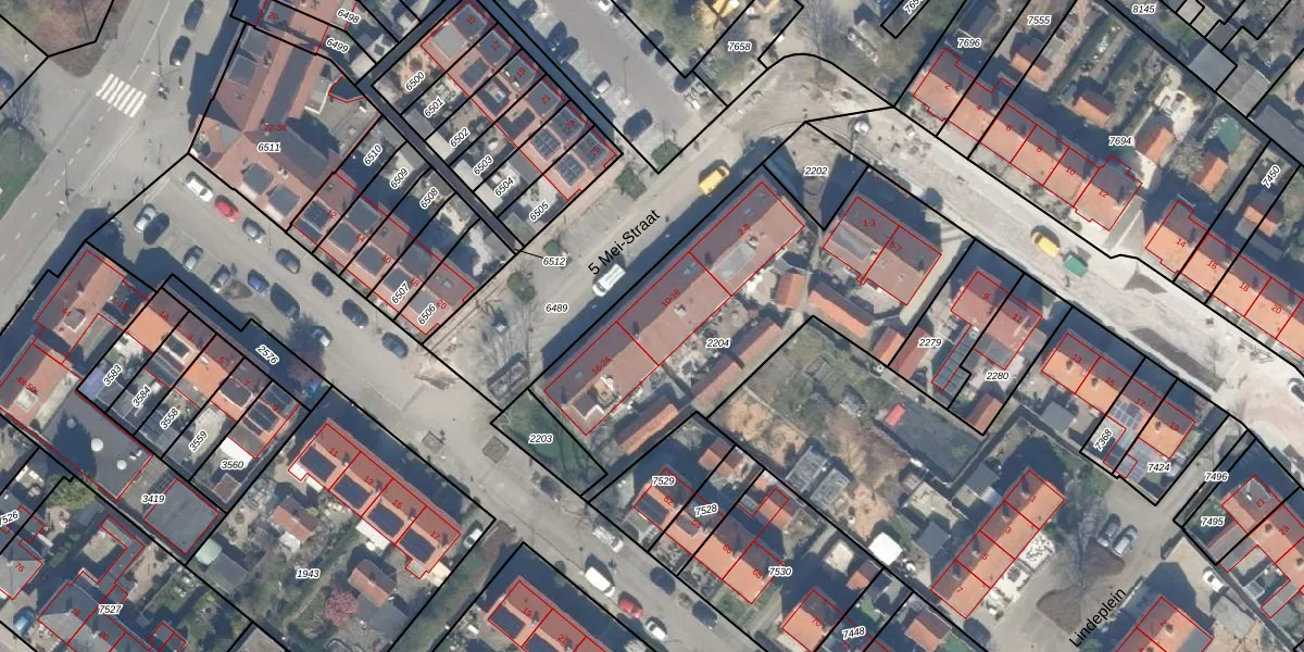 Het perceel waarop 5 Mei-Straat 16 staat heeft een oppervlakte van 1473 m². Dit is een zeer groot perceel. De perceeloppervlakte wordt geregistreerd door het Kadaster. Gedetailleerde informatie over de maten van dit perceel kunt u vinden in het rapport Kadastrale kaart met maatvoering van 5 Mei-Straat 16.