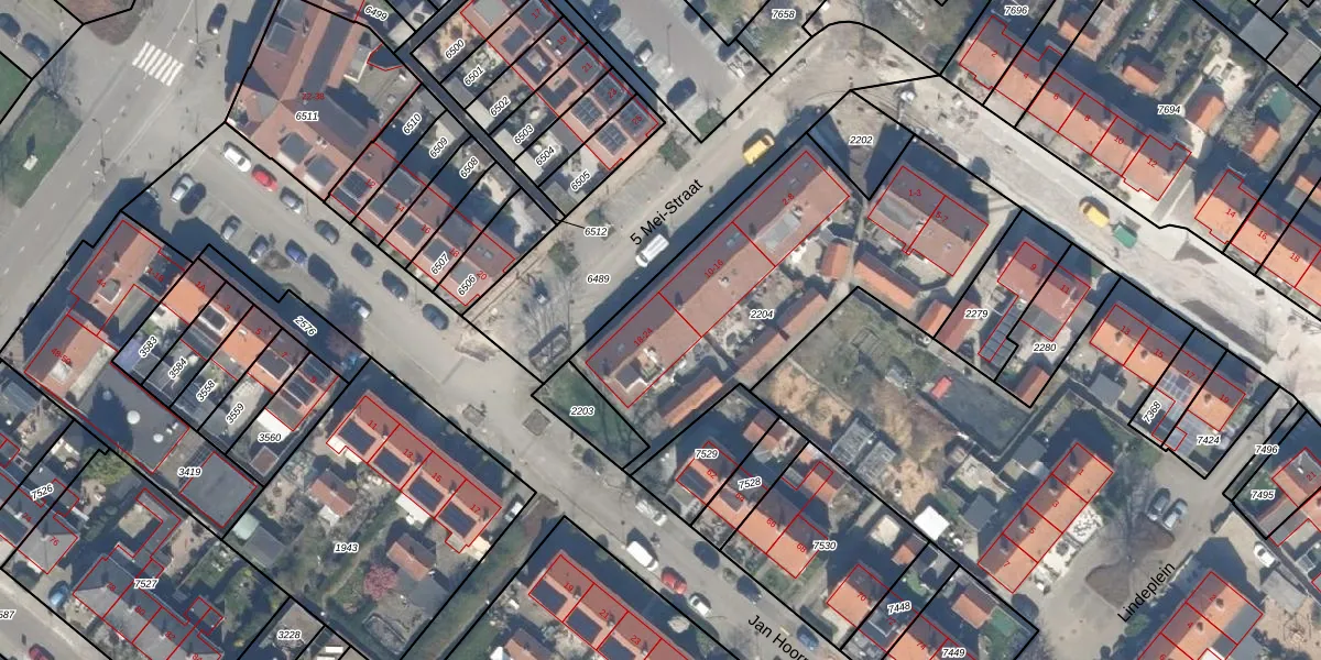 Het perceel waarop 5 Mei-Straat 20 staat heeft een oppervlakte van 1473 m². Dit is een zeer groot perceel. De perceeloppervlakte wordt geregistreerd door het Kadaster. Gedetailleerde informatie over de maten van dit perceel kunt u vinden in het rapport Kadastrale kaart met maatvoering van 5 Mei-Straat 20.