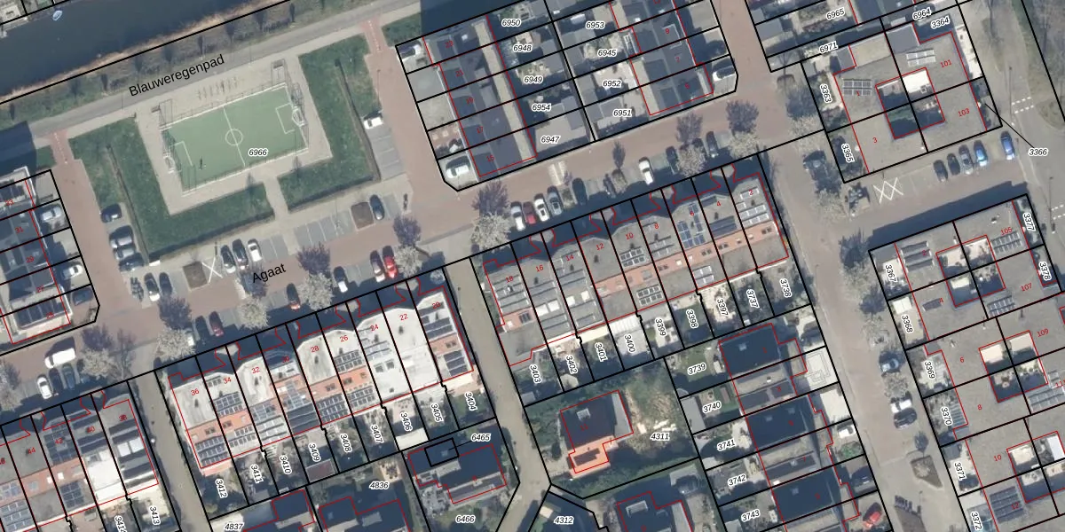 Het perceel waarop Agaat 16 staat heeft een oppervlakte van 180 m². Dit is een middelgroot perceel. De perceeloppervlakte wordt geregistreerd door het Kadaster. Gedetailleerde informatie over de maten van dit perceel kunt u vinden in het rapport Kadastrale kaart met maatvoering van Agaat 16.