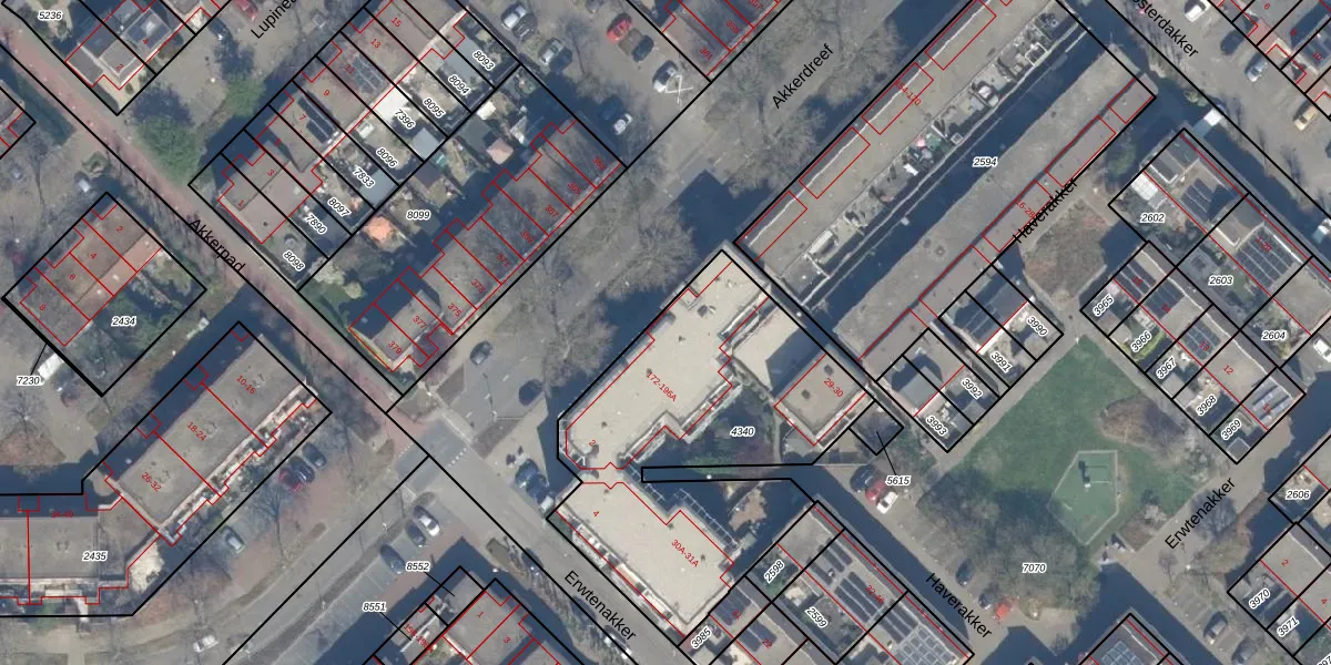 Het perceel waarop Akkerdreef 178-A staat heeft een oppervlakte van 1518 m². Dit is een zeer groot perceel. De perceeloppervlakte wordt geregistreerd door het Kadaster. Gedetailleerde informatie over de maten van dit perceel kunt u vinden in het rapport Kadastrale kaart met maatvoering van Akkerdreef 178-A.