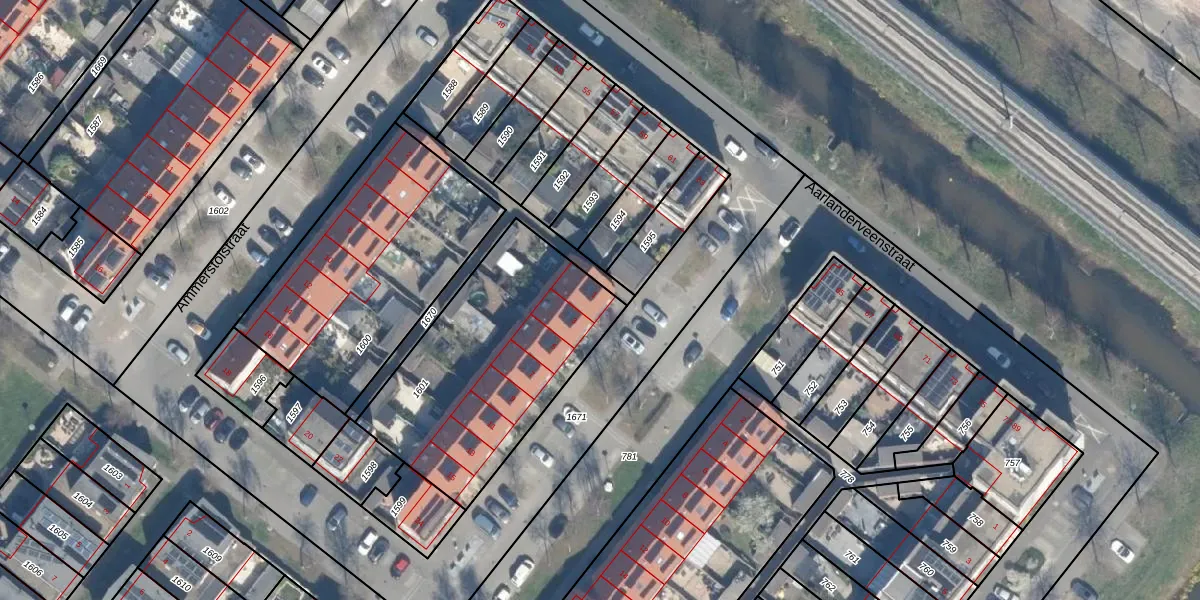 Het perceel waarop Ameidestraat 1 staat heeft een oppervlakte van 1024 m². Dit is een zeer groot perceel. De perceeloppervlakte wordt geregistreerd door het Kadaster. Gedetailleerde informatie over de maten van dit perceel kunt u vinden in het rapport Kadastrale kaart met maatvoering van Ameidestraat 1.