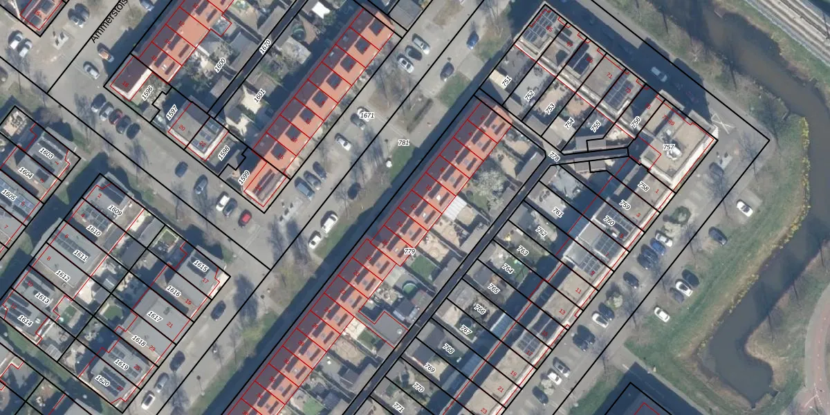 Het perceel waarop Ameidestraat 12 staat heeft een oppervlakte van 2361 m². Dit is een zeer groot perceel. De perceeloppervlakte wordt geregistreerd door het Kadaster. Gedetailleerde informatie over de maten van dit perceel kunt u vinden in het rapport Kadastrale kaart met maatvoering van Ameidestraat 12.