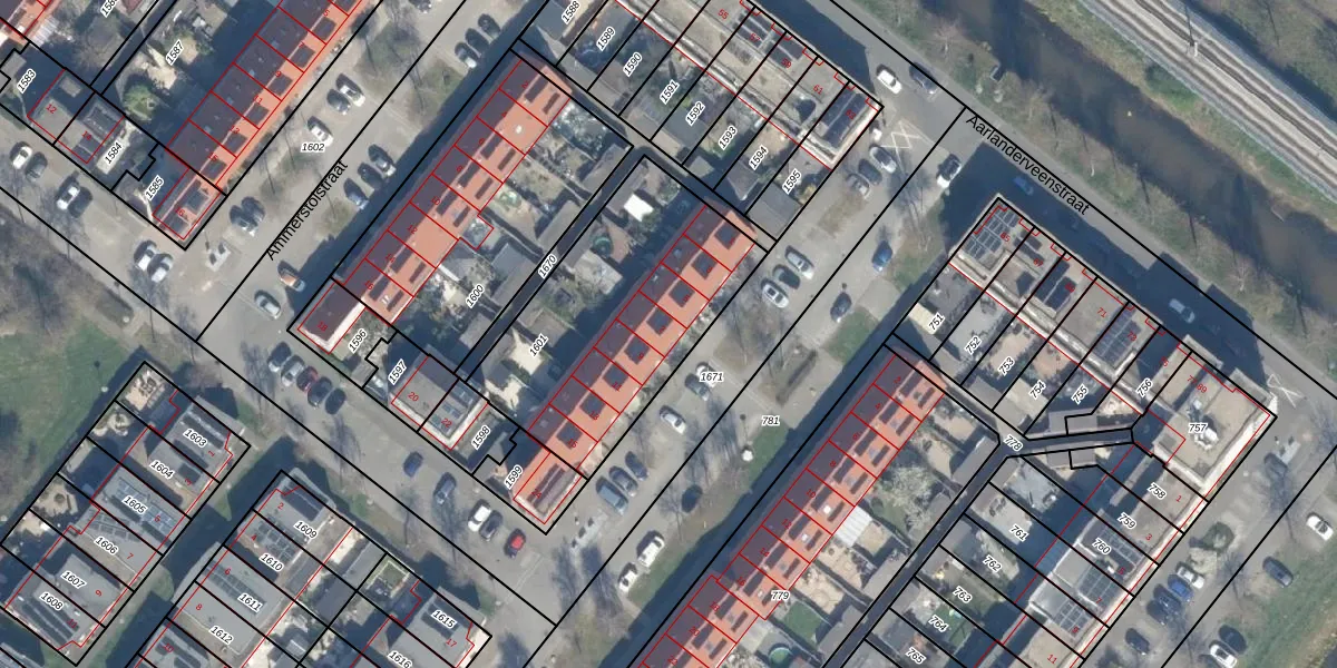 Het perceel waarop Ameidestraat 7 staat heeft een oppervlakte van 1024 m². Dit is een zeer groot perceel. De perceeloppervlakte wordt geregistreerd door het Kadaster. Gedetailleerde informatie over de maten van dit perceel kunt u vinden in het rapport Kadastrale kaart met maatvoering van Ameidestraat 7.