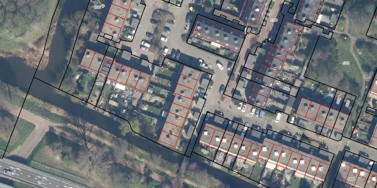 Het perceel waarop Andriessenrode 45 staat heeft een oppervlakte van 2100 m². Dit is een zeer groot perceel. De perceeloppervlakte wordt geregistreerd door het Kadaster. Gedetailleerde informatie over de maten van dit perceel kunt u vinden in het rapport Kadastrale kaart met maatvoering van Andriessenrode 45.