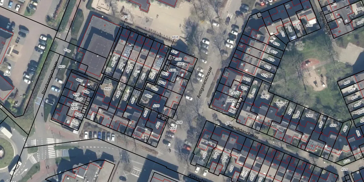 Het perceel waarop Antigoneschouw 8 staat heeft een oppervlakte van 103 m². Dit is een middelgroot perceel. De perceeloppervlakte wordt geregistreerd door het Kadaster. Gedetailleerde informatie over de maten van dit perceel kunt u vinden in het rapport Kadastrale kaart met maatvoering van Antigoneschouw 8.