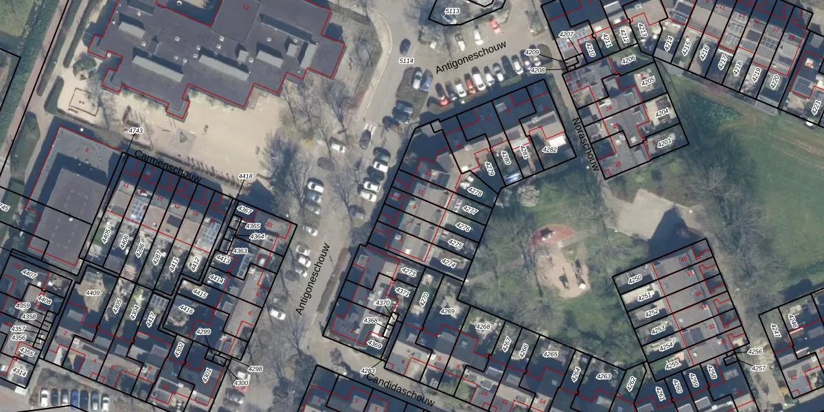 Het perceel waarop Antigoneschouw 9 staat heeft een oppervlakte van 111 m². Dit is een middelgroot perceel. De perceeloppervlakte wordt geregistreerd door het Kadaster. Gedetailleerde informatie over de maten van dit perceel kunt u vinden in het rapport Kadastrale kaart met maatvoering van Antigoneschouw 9.