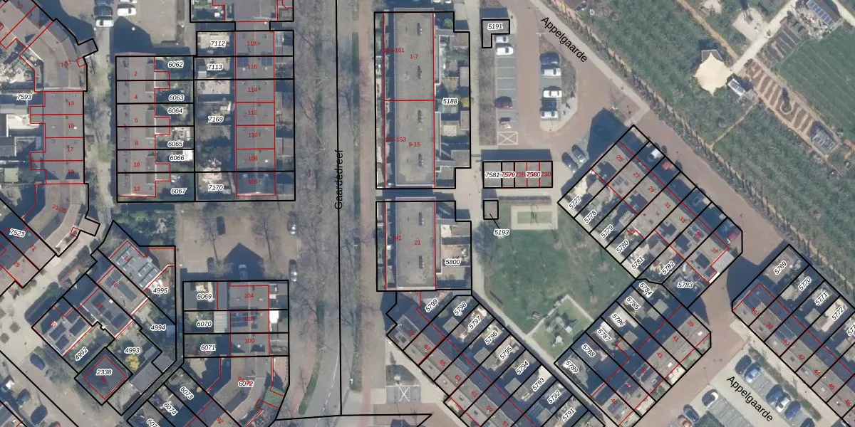 Het perceel waarop Appelgaarde 17 staat heeft een oppervlakte van 470 m². Dit is een groot perceel. De perceeloppervlakte wordt geregistreerd door het Kadaster. Gedetailleerde informatie over de maten van dit perceel kunt u vinden in het rapport Kadastrale kaart met maatvoering van Appelgaarde 17.