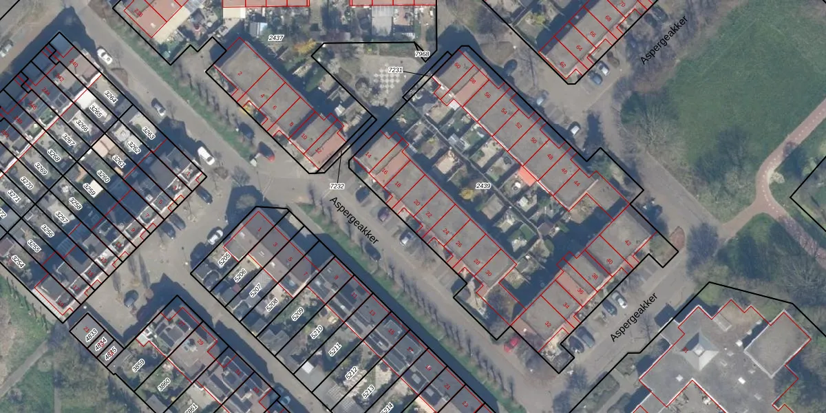 Het perceel waarop Aspergeakker 20 staat heeft een oppervlakte van 2984 m². Dit is een zeer groot perceel. De perceeloppervlakte wordt geregistreerd door het Kadaster. Gedetailleerde informatie over de maten van dit perceel kunt u vinden in het rapport Kadastrale kaart met maatvoering van Aspergeakker 20.