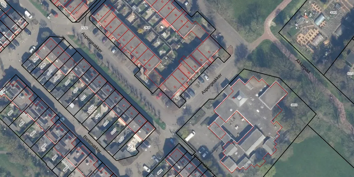 Het perceel waarop Aspergeakker 32 staat heeft een oppervlakte van 2984 m². Dit is een zeer groot perceel. De perceeloppervlakte wordt geregistreerd door het Kadaster. Gedetailleerde informatie over de maten van dit perceel kunt u vinden in het rapport Kadastrale kaart met maatvoering van Aspergeakker 32.
