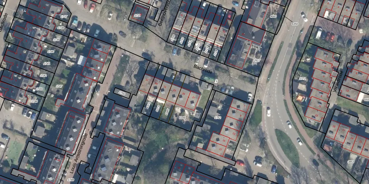 Het perceel waarop Bachrode 25 staat heeft een oppervlakte van 434 m². Dit is een groot perceel. De perceeloppervlakte wordt geregistreerd door het Kadaster. Gedetailleerde informatie over de maten van dit perceel kunt u vinden in het rapport Kadastrale kaart met maatvoering van Bachrode 25.