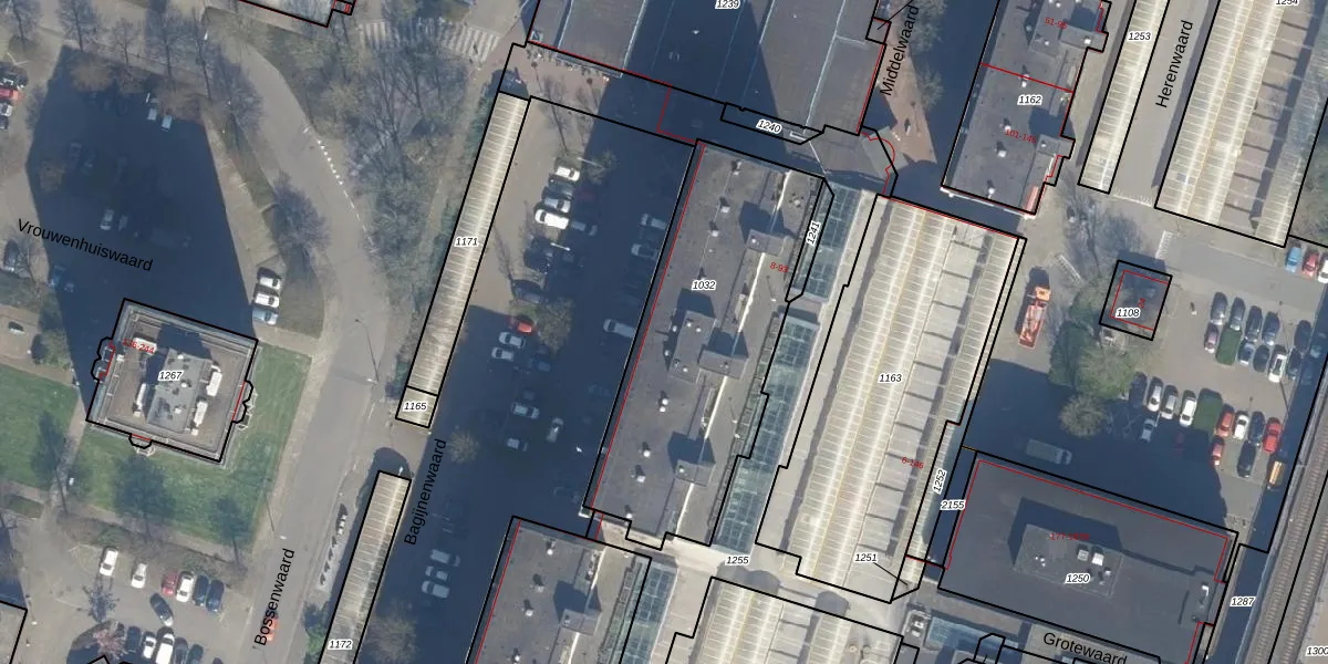 Het perceel waarop Bagijnenwaard 48 staat heeft een oppervlakte van 1202 m². Dit is een zeer groot perceel. De perceeloppervlakte wordt geregistreerd door het Kadaster. Gedetailleerde informatie over de maten van dit perceel kunt u vinden in het rapport Kadastrale kaart met maatvoering van Bagijnenwaard 48.