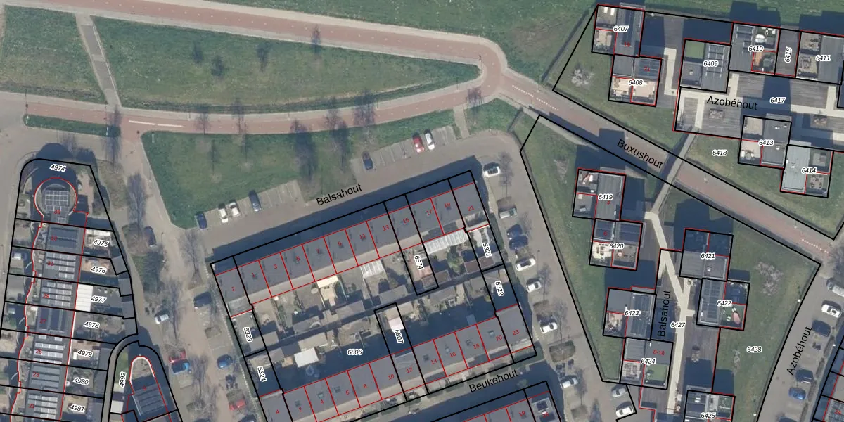 Het perceel waarop Balsahout 17 staat heeft een oppervlakte van 2264 m². Dit is een zeer groot perceel. De perceeloppervlakte wordt geregistreerd door het Kadaster. Gedetailleerde informatie over de maten van dit perceel kunt u vinden in het rapport Kadastrale kaart met maatvoering van Balsahout 17.