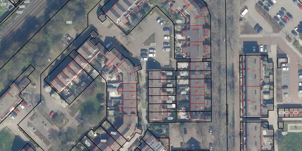 Gebruik de zoekbalk of klik op een perceel voor informatie over de adressen binnen dit perceel.
