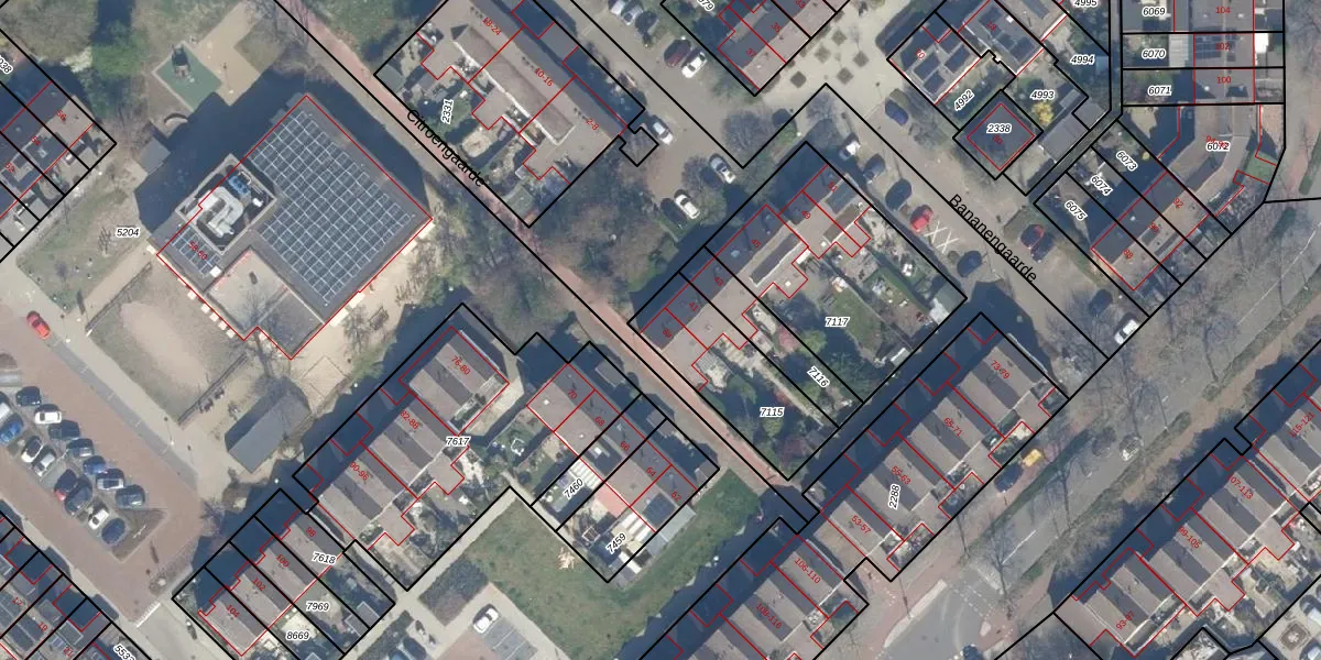 Het perceel waarop Bananengaarde 39 staat heeft een oppervlakte van 376 m². Dit is een groot perceel. De perceeloppervlakte wordt geregistreerd door het Kadaster. Gedetailleerde informatie over de maten van dit perceel kunt u vinden in het rapport Kadastrale kaart met maatvoering van Bananengaarde 39.