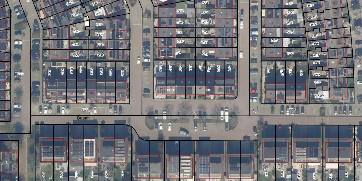 Het perceel waarop Basalt 62 staat heeft een oppervlakte van 116 m². Dit is een middelgroot perceel. De perceeloppervlakte wordt geregistreerd door het Kadaster. Gedetailleerde informatie over de maten van dit perceel kunt u vinden in het rapport Kadastrale kaart met maatvoering van Basalt 62.