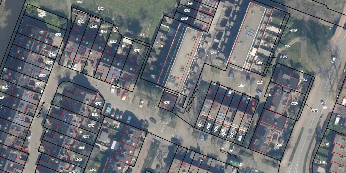 Het perceel waarop Beethovenrode 39 staat heeft een oppervlakte van 2822 m². Dit is een zeer groot perceel. De perceeloppervlakte wordt geregistreerd door het Kadaster. Gedetailleerde informatie over de maten van dit perceel kunt u vinden in het rapport Kadastrale kaart met maatvoering van Beethovenrode 39.