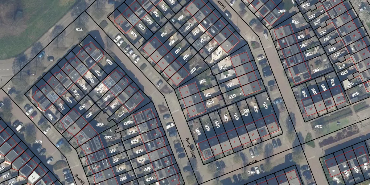 Het perceel waarop Bergkristal 12 staat heeft een oppervlakte van 187 m². Dit is een middelgroot perceel. De perceeloppervlakte wordt geregistreerd door het Kadaster. Gedetailleerde informatie over de maten van dit perceel kunt u vinden in het rapport Kadastrale kaart met maatvoering van Bergkristal 12.