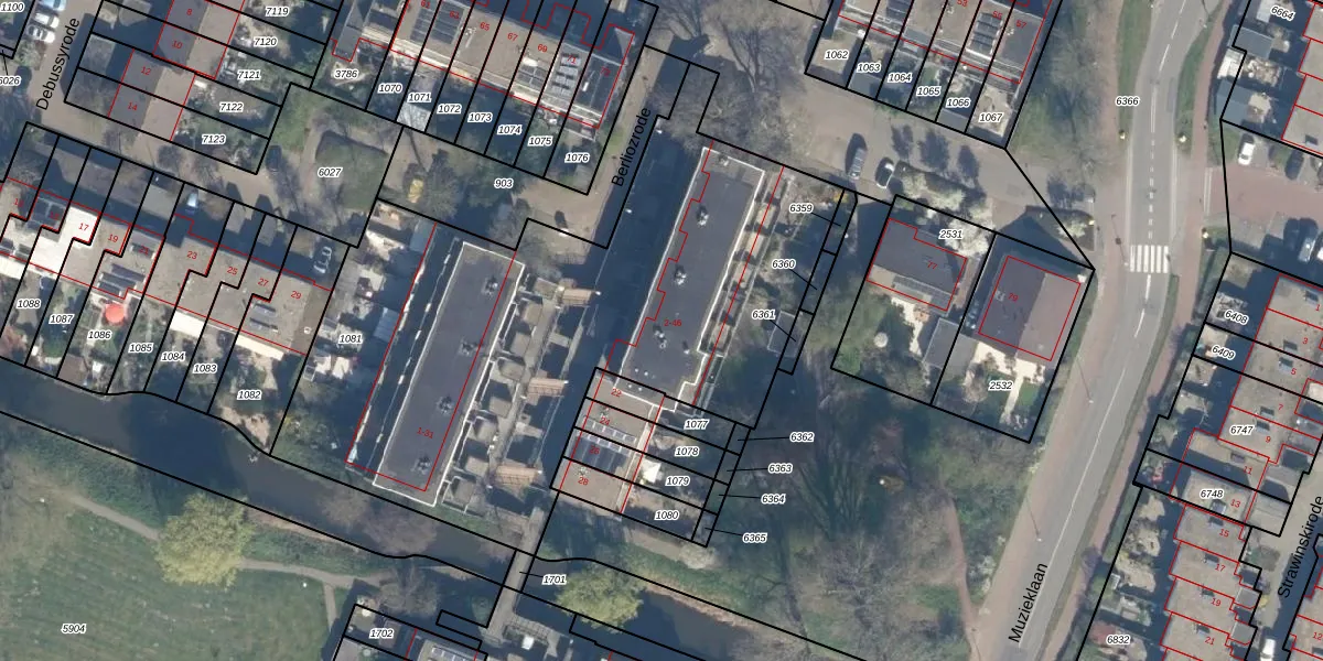 Het perceel waarop Berliozrode 30 staat heeft een oppervlakte van 2987 m². Dit is een zeer groot perceel. De perceeloppervlakte wordt geregistreerd door het Kadaster. Gedetailleerde informatie over de maten van dit perceel kunt u vinden in het rapport Kadastrale kaart met maatvoering van Berliozrode 30.