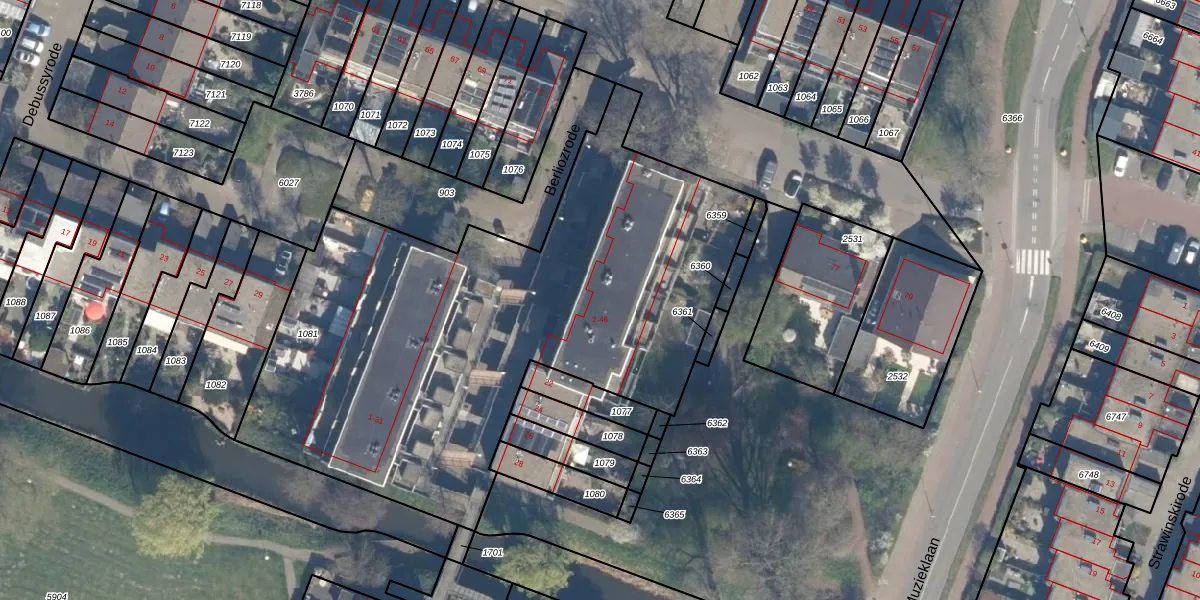 Het perceel waarop Berliozrode 6 staat heeft een oppervlakte van 2987 m². Dit is een zeer groot perceel. De perceeloppervlakte wordt geregistreerd door het Kadaster. Gedetailleerde informatie over de maten van dit perceel kunt u vinden in het rapport Kadastrale kaart met maatvoering van Berliozrode 6.