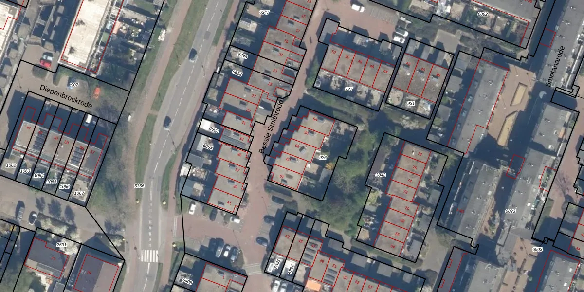Het perceel waarop Bessie Smithrode 58 staat heeft een oppervlakte van 612 m². Dit is een groot perceel. De perceeloppervlakte wordt geregistreerd door het Kadaster. Gedetailleerde informatie over de maten van dit perceel kunt u vinden in het rapport Kadastrale kaart met maatvoering van Bessie Smithrode 58.