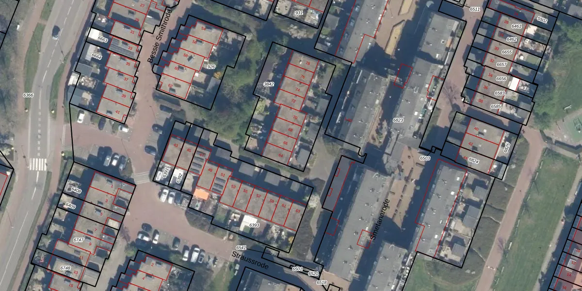 Het perceel waarop Bessie Smithrode 66 staat heeft een oppervlakte van 896 m². Dit is een groot perceel. De perceeloppervlakte wordt geregistreerd door het Kadaster. Gedetailleerde informatie over de maten van dit perceel kunt u vinden in het rapport Kadastrale kaart met maatvoering van Bessie Smithrode 66.