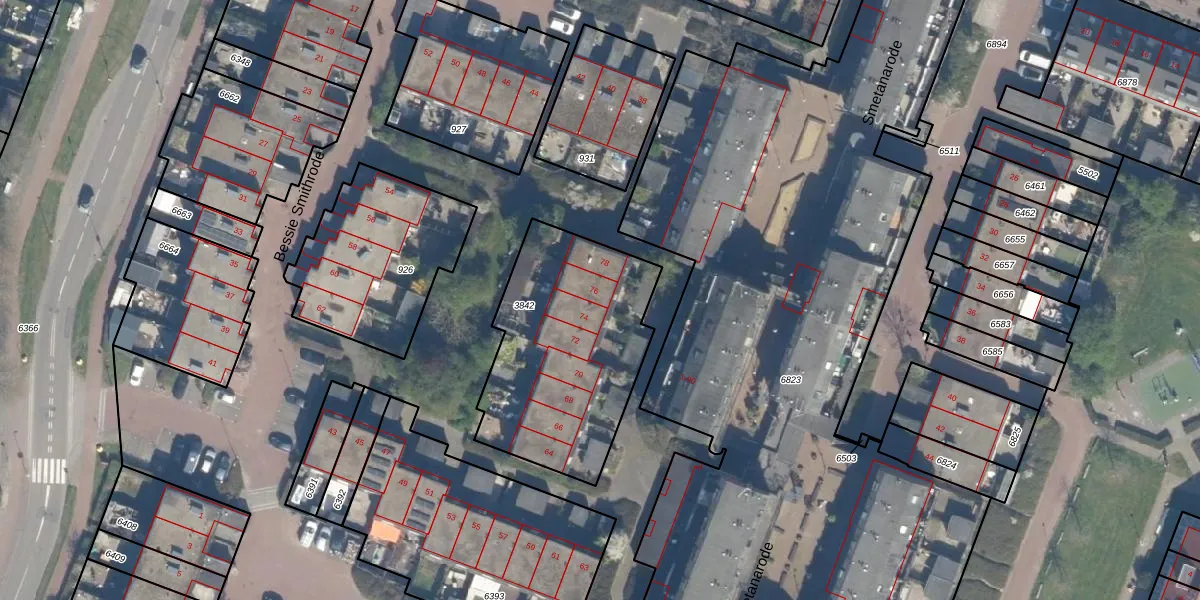 Het perceel waarop Bessie Smithrode 76 staat heeft een oppervlakte van 896 m². Dit is een groot perceel. De perceeloppervlakte wordt geregistreerd door het Kadaster. Gedetailleerde informatie over de maten van dit perceel kunt u vinden in het rapport Kadastrale kaart met maatvoering van Bessie Smithrode 76.