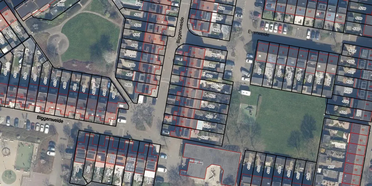 Het perceel waarop Biggenweide 28 staat heeft een oppervlakte van 181 m². Dit is een middelgroot perceel. De perceeloppervlakte wordt geregistreerd door het Kadaster. Gedetailleerde informatie over de maten van dit perceel kunt u vinden in het rapport Kadastrale kaart met maatvoering van Biggenweide 28.