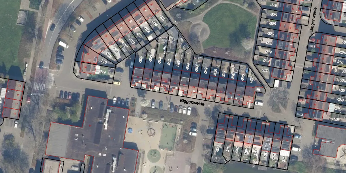 Biggenweide 43 is gelegen op kadastraal perceel ZWD01B4377. Deze kadastrale aanduiding is uniek en wordt gebruikt door het Kadaster om eigendomsrechten en andere zakelijke rechten vast te leggen. Het perceel maakt onderdeel uit van de kadastrale gemeente Zegwaard.