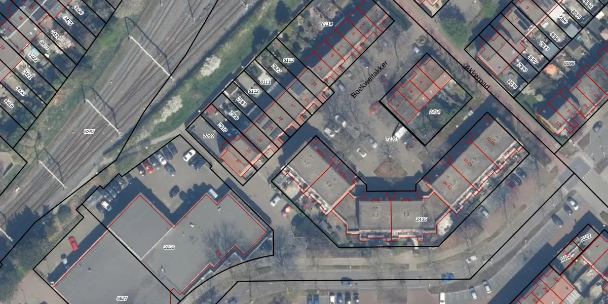 Het perceel waarop Boekweitakker 64 staat heeft een oppervlakte van 1784 m². Dit is een zeer groot perceel. De perceeloppervlakte wordt geregistreerd door het Kadaster. Gedetailleerde informatie over de maten van dit perceel kunt u vinden in het rapport Kadastrale kaart met maatvoering van Boekweitakker 64.