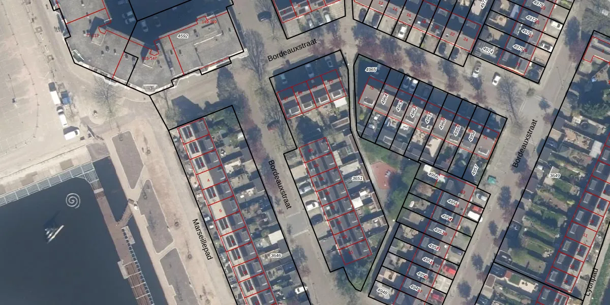 Het perceel waarop Bordeauxstraat 65 staat heeft een oppervlakte van 1581 m². Dit is een zeer groot perceel. De perceeloppervlakte wordt geregistreerd door het Kadaster. Gedetailleerde informatie over de maten van dit perceel kunt u vinden in het rapport Kadastrale kaart met maatvoering van Bordeauxstraat 65.