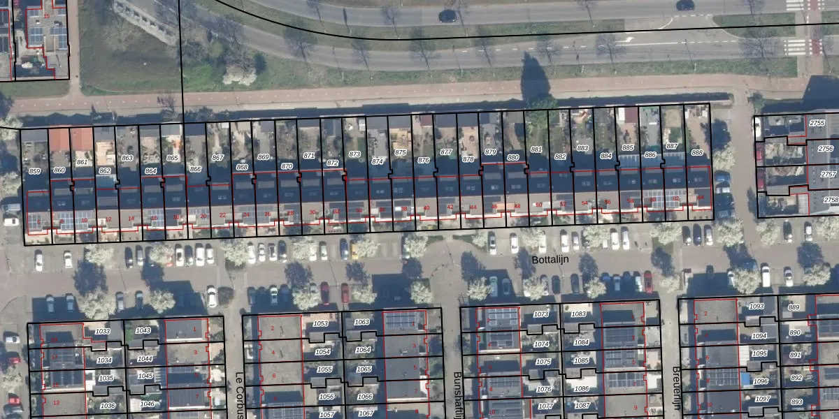 Het perceel waarop Bottalijn 40 staat heeft een oppervlakte van 150 m². Dit is een middelgroot perceel. De perceeloppervlakte wordt geregistreerd door het Kadaster. Gedetailleerde informatie over de maten van dit perceel kunt u vinden in het rapport Kadastrale kaart met maatvoering van Bottalijn 40.