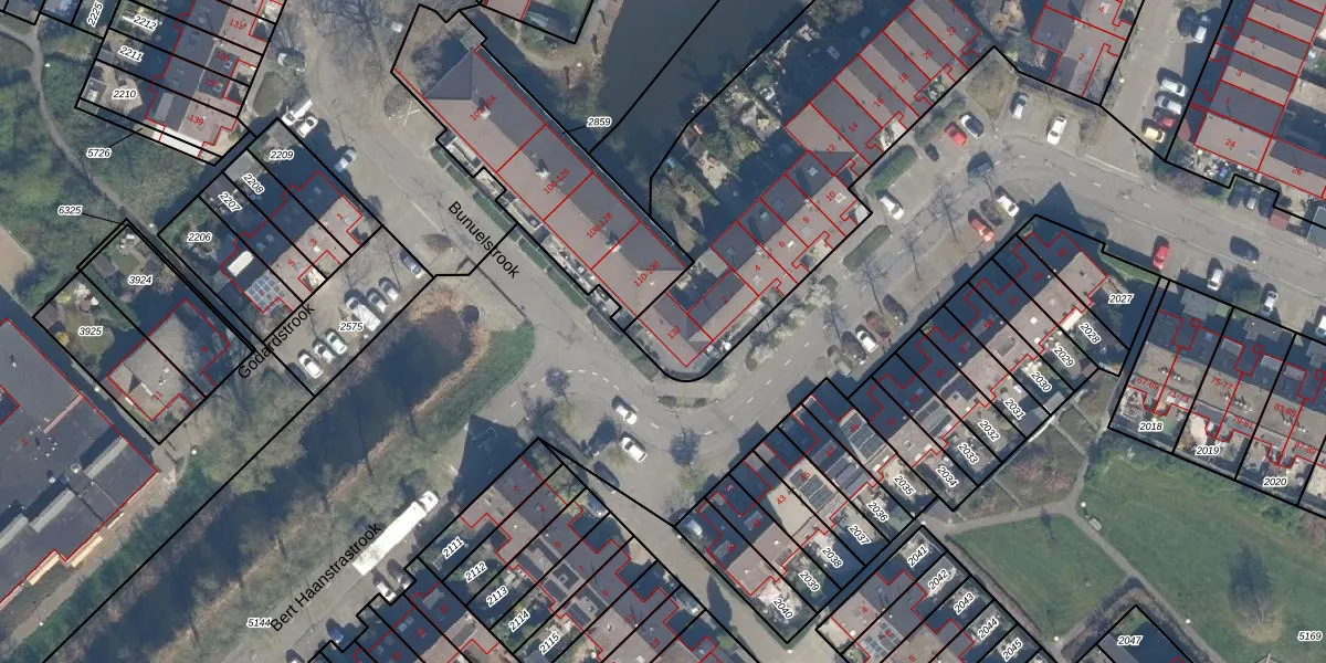 Het perceel waarop Bunuelstrook 132 staat heeft een oppervlakte van 3597 m². Dit is een zeer groot perceel. De perceeloppervlakte wordt geregistreerd door het Kadaster. Gedetailleerde informatie over de maten van dit perceel kunt u vinden in het rapport Kadastrale kaart met maatvoering van Bunuelstrook 132.