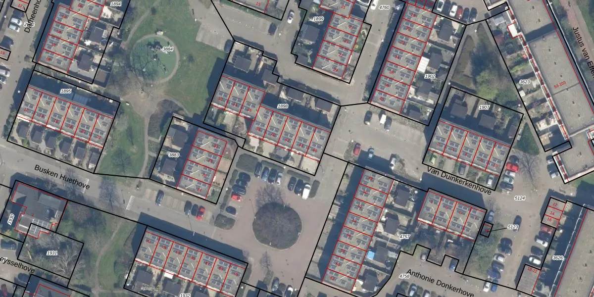 Het perceel waarop Busken Huethove 44 staat heeft een oppervlakte van 1107 m². Dit is een zeer groot perceel. De perceeloppervlakte wordt geregistreerd door het Kadaster. Gedetailleerde informatie over de maten van dit perceel kunt u vinden in het rapport Kadastrale kaart met maatvoering van Busken Huethove 44.