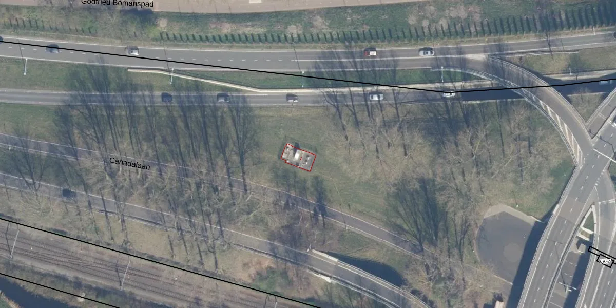 Het perceel waarop Canadalaan 1 staat heeft een oppervlakte van 6,4 ha. Dit is een zeer groot perceel. De perceeloppervlakte wordt geregistreerd door het Kadaster. Gedetailleerde informatie over de maten van dit perceel kunt u vinden in het rapport Kadastrale kaart met maatvoering van Canadalaan 1.