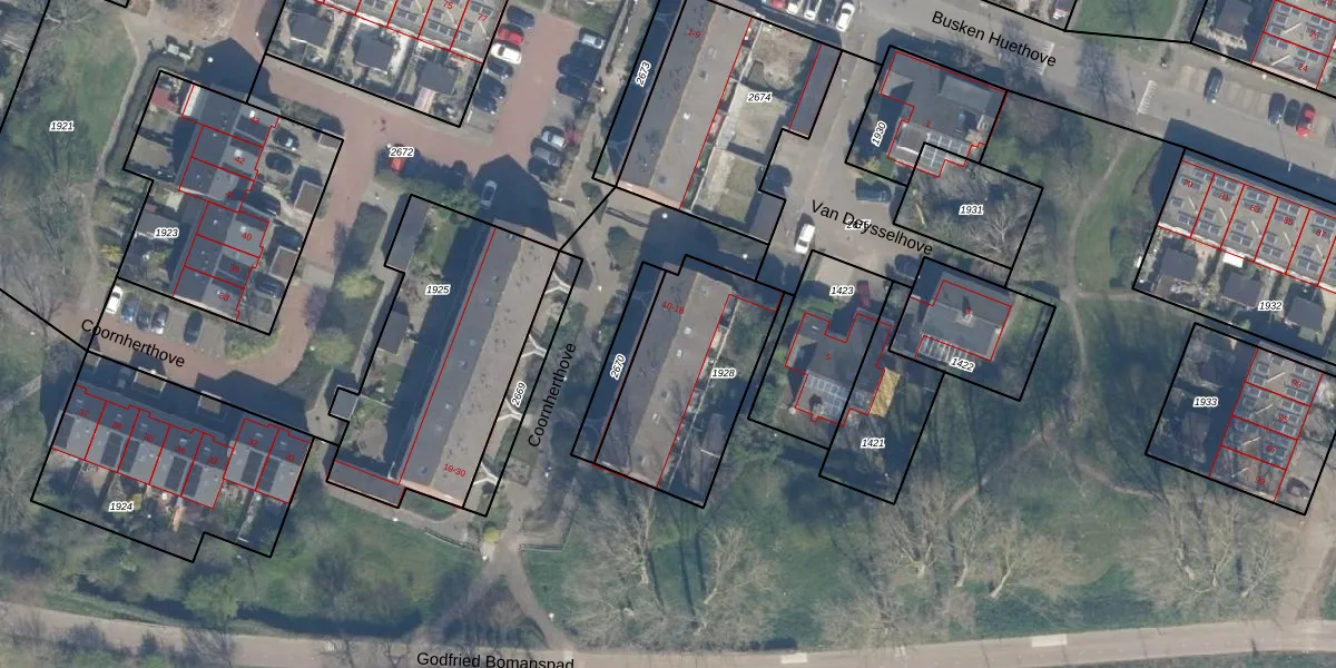 Het perceel waarop Coornherthove 14 staat heeft een oppervlakte van 595 m². Dit is een groot perceel. De perceeloppervlakte wordt geregistreerd door het Kadaster. Gedetailleerde informatie over de maten van dit perceel kunt u vinden in het rapport Kadastrale kaart met maatvoering van Coornherthove 14.