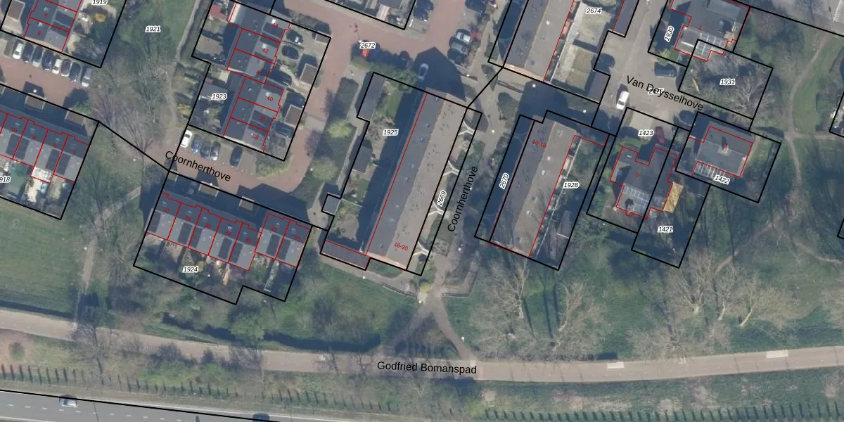 Het perceel waarop Coornherthove 20 staat heeft een oppervlakte van 934 m². Dit is een groot perceel. De perceeloppervlakte wordt geregistreerd door het Kadaster. Gedetailleerde informatie over de maten van dit perceel kunt u vinden in het rapport Kadastrale kaart met maatvoering van Coornherthove 20.