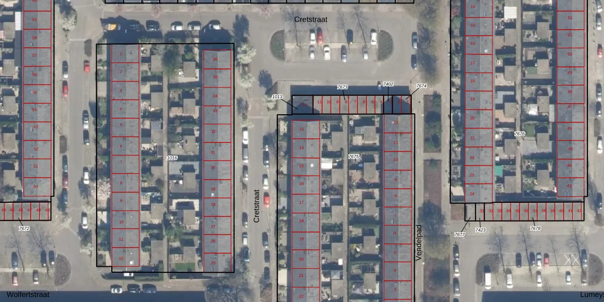 Het perceel waarop Cretstraat 14 staat heeft een oppervlakte van 3437 m². Dit is een zeer groot perceel. De perceeloppervlakte wordt geregistreerd door het Kadaster. Gedetailleerde informatie over de maten van dit perceel kunt u vinden in het rapport Kadastrale kaart met maatvoering van Cretstraat 14.