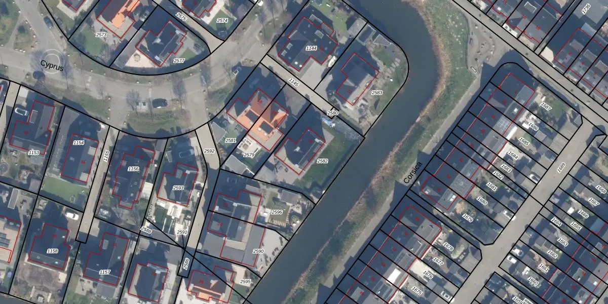 Het perceel waarop Cyprus 14 staat heeft een oppervlakte van 615 m². Dit is een groot perceel. De perceeloppervlakte wordt geregistreerd door het Kadaster. Gedetailleerde informatie over de maten van dit perceel kunt u vinden in het rapport Kadastrale kaart met maatvoering van Cyprus 14.