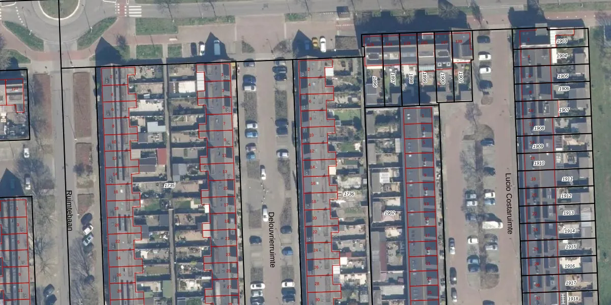 Het perceel waarop Delouvrierruimte 12 staat heeft een oppervlakte van 2184 m². Dit is een zeer groot perceel. De perceeloppervlakte wordt geregistreerd door het Kadaster. Gedetailleerde informatie over de maten van dit perceel kunt u vinden in het rapport Kadastrale kaart met maatvoering van Delouvrierruimte 12.