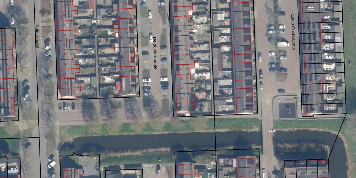 Het perceel waarop Delouvrierruimte 30 staat heeft een oppervlakte van 2184 m². Dit is een zeer groot perceel. De perceeloppervlakte wordt geregistreerd door het Kadaster. Gedetailleerde informatie over de maten van dit perceel kunt u vinden in het rapport Kadastrale kaart met maatvoering van Delouvrierruimte 30.