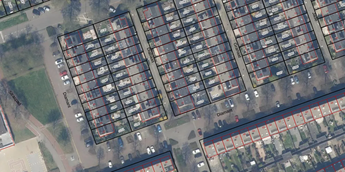 Het perceel waarop Diabaas 18 staat heeft een oppervlakte van 119 m². Dit is een middelgroot perceel. De perceeloppervlakte wordt geregistreerd door het Kadaster. Gedetailleerde informatie over de maten van dit perceel kunt u vinden in het rapport Kadastrale kaart met maatvoering van Diabaas 18.