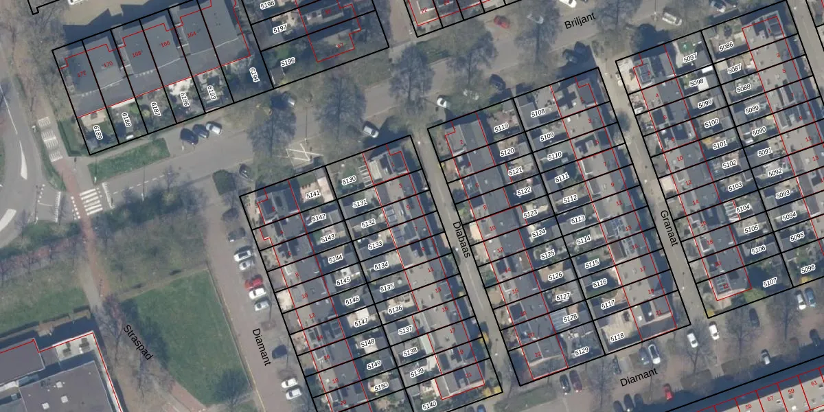 Het perceel waarop Diabaas 5 staat heeft een oppervlakte van 119 m². Dit is een middelgroot perceel. De perceeloppervlakte wordt geregistreerd door het Kadaster. Gedetailleerde informatie over de maten van dit perceel kunt u vinden in het rapport Kadastrale kaart met maatvoering van Diabaas 5.