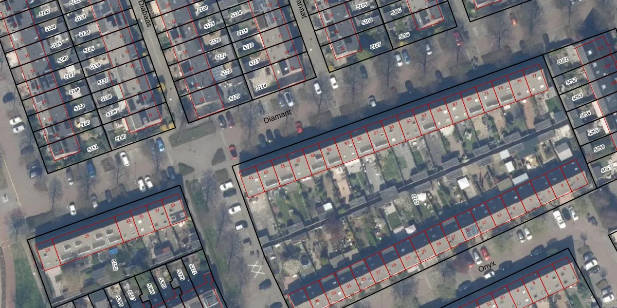 Het perceel waarop Diamant 49 staat heeft een oppervlakte van 5580 m². Dit is een zeer groot perceel. De perceeloppervlakte wordt geregistreerd door het Kadaster. Gedetailleerde informatie over de maten van dit perceel kunt u vinden in het rapport Kadastrale kaart met maatvoering van Diamant 49.