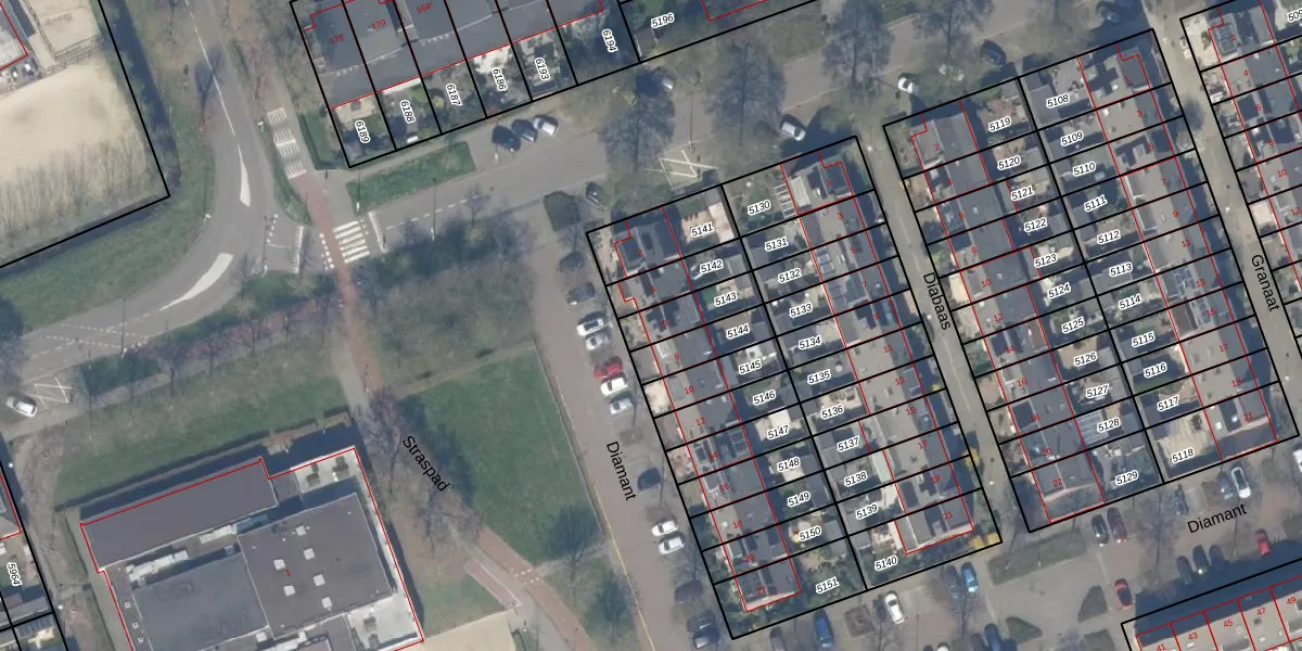 Het perceel waarop Diamant 6 staat heeft een oppervlakte van 119 m². Dit is een middelgroot perceel. De perceeloppervlakte wordt geregistreerd door het Kadaster. Gedetailleerde informatie over de maten van dit perceel kunt u vinden in het rapport Kadastrale kaart met maatvoering van Diamant 6.