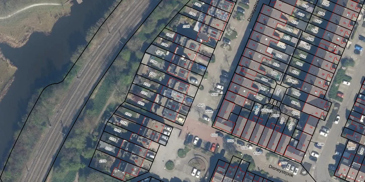 Het perceel waarop Disneystrook 56 staat heeft een oppervlakte van 225 m². Dit is een middelgroot perceel. De perceeloppervlakte wordt geregistreerd door het Kadaster. Gedetailleerde informatie over de maten van dit perceel kunt u vinden in het rapport Kadastrale kaart met maatvoering van Disneystrook 56.